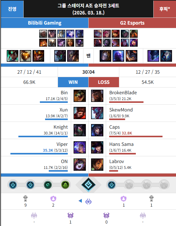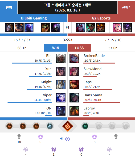 | 매치 결과 | Bilibili Gaming (BLG) 3 : 0 G2 Esports |