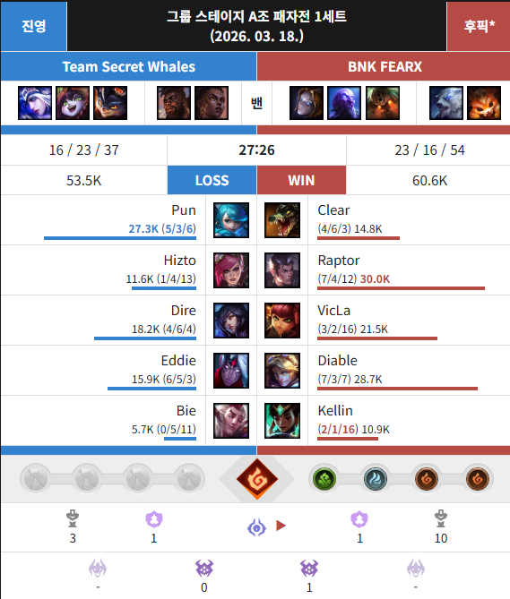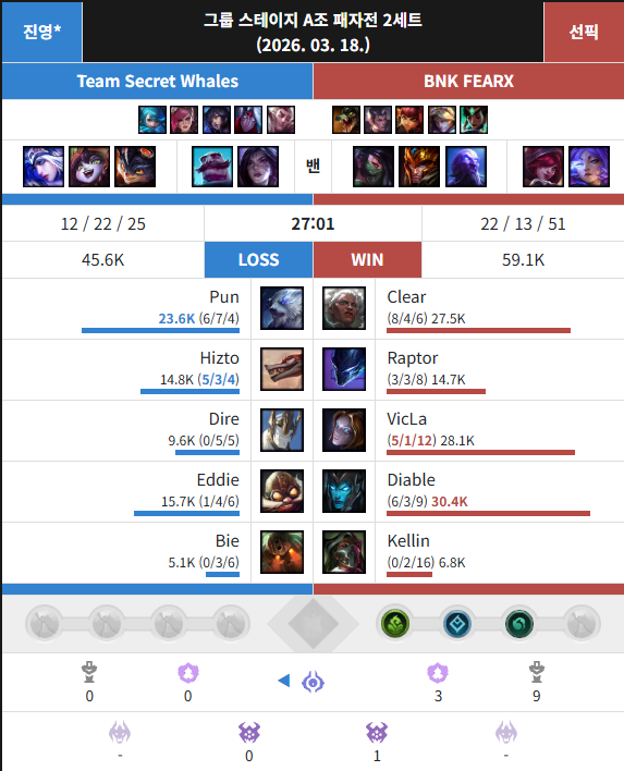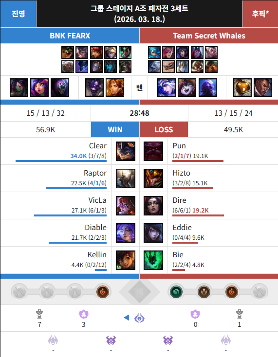 | 매치 결과 | BNK FEARX (BFX) 3 : 0 Team Secret Whales (TSW) |