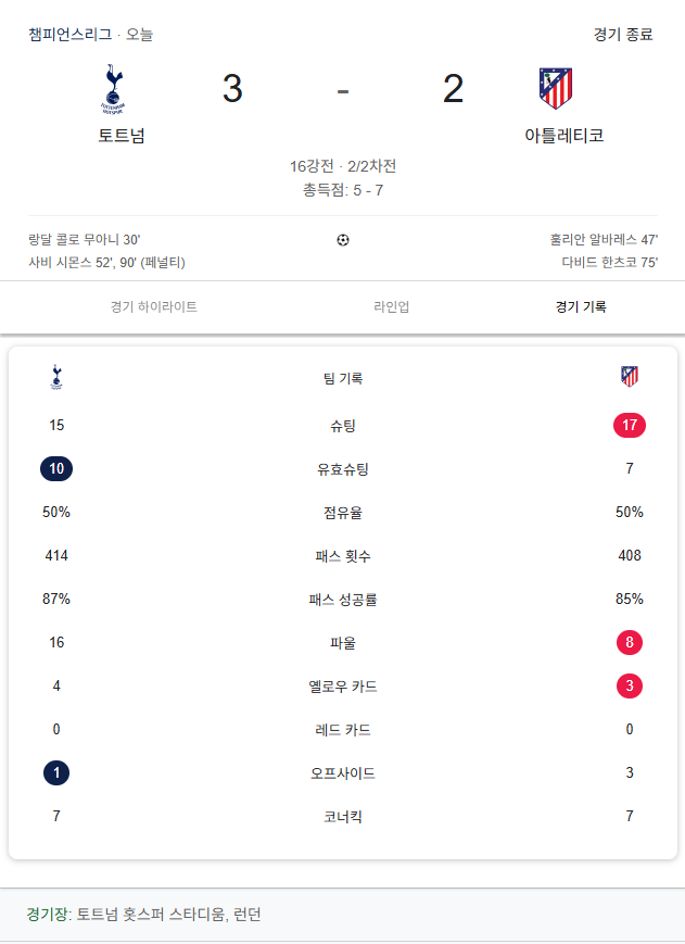 하지만 아틀레티코의 저력은 매서웠습니다. 후반 시작 직후인 47분, 아데몰라 루크먼의 패스를 받은 훌리안 알바레스가 환상적인 턴에 이은 슈팅으로 동점골을 터뜨렸습니다. 토트넘은 굴하지 않고 5분 뒤 사비 시몬스의 환상적인 25야드 감아차기 중거리 슛으로 다시 리드를 잡았으나, 후반 75분 코너킥 상황에서 다비드 한츠코에게 헤더 동점골을 허용하며 추격의 동력을 잃고 말았습니다. 후반 90분 시몬스가 페널티킥을 성공시키며 3-2 승리를 거두었지만, 1차전의 격차를 뒤집기엔 역부족이었습니다.